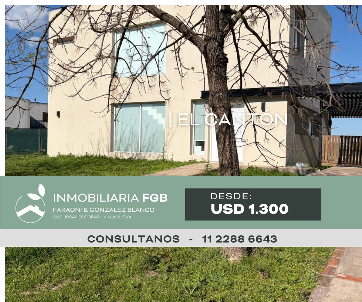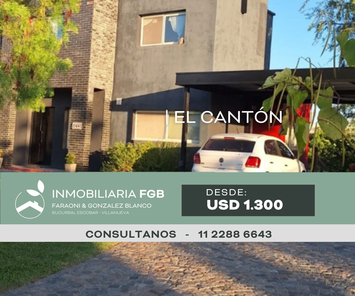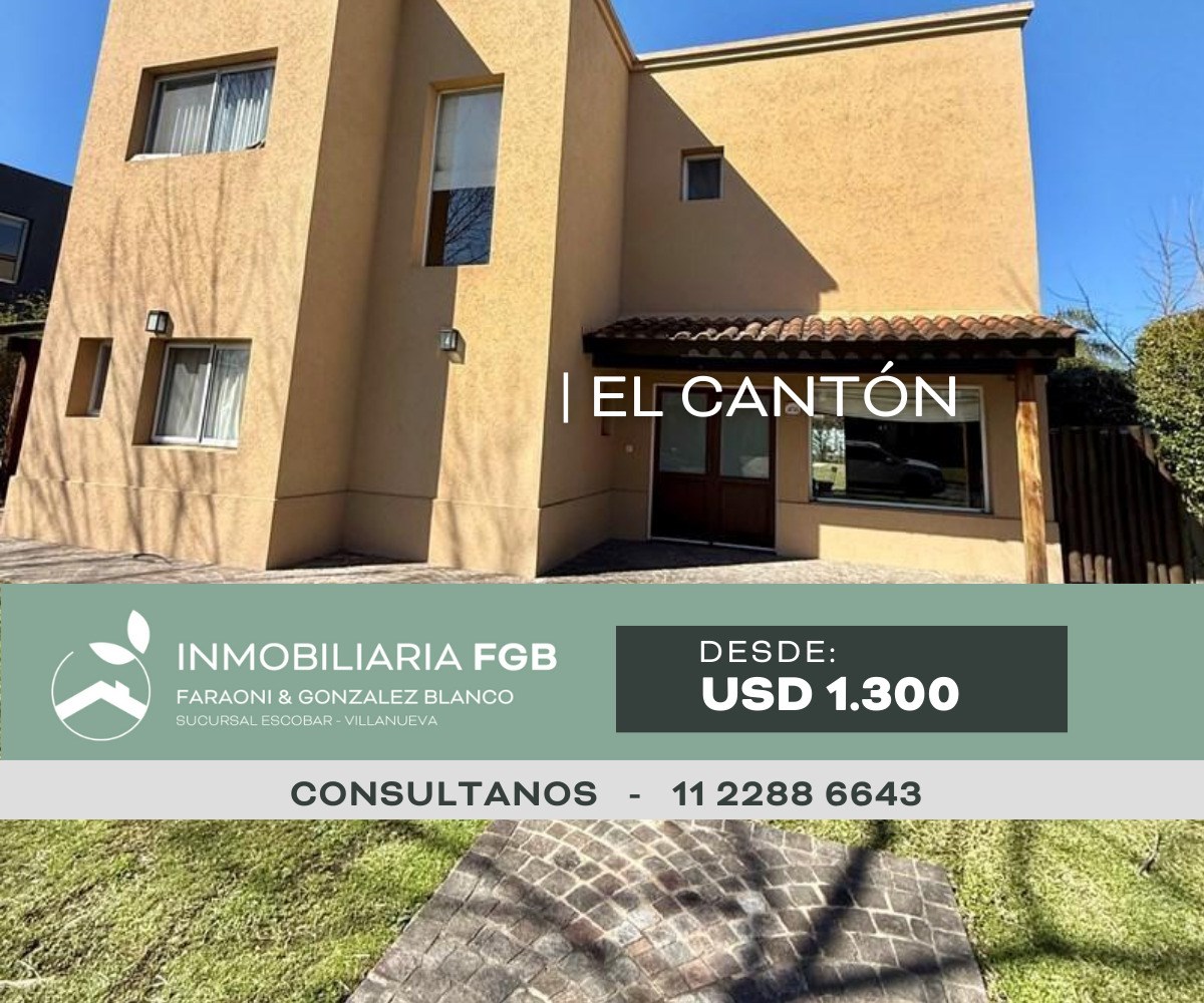 --- ALQUILER ANUAL EN EL CANTÓN --- CONSULTANOS POR CASAS EN ALQUILER DESDE 1.300USD. TE OFRECEMOS UN SERVICIO PERSONALIZADO EN LA BUSQUEDA DE TU PROXIMO HOGAR! CONTACTANOS! IG: @inmobiliaria_FGB EL CANTÓN está ubicado en la localidad de Maschwitz en el partido de Escobar a la altura del Km. 44 de la panamericana. El barrio cuenta con un excelente acceso desde un viaducto de la panamericana hasta el acceso principal al barrio llamado Avenida de los Lagos y cuenta con otro ingreso en el otro extremo cercano a Escobar. El Cantón está dividido en 4 Barrios (Puerto, Islas, Golf, Norte) con una vía de acceso rápido que vincula los 4 barrios. La superficie promedio de los lotes es de 800m2. Se destaca la presencia de lagunas siendo el 65% de los lotes con espejos de agua. El barrio cuenta con todos los servicios, cada barrio tiene su propio Club House. Amenities: - Club de Golf de 18 hoyos - Club deportivo - Canchas de tenis - Canchas de voley - Canchas de futbol - Pileta - Plaza de juegos para niños El Cantón tiene un total de 2.335 lotes: - Barrio Norte: 938 lotes - Barrio Islas: 553 lotes - Barrio Golf: 463 lotes